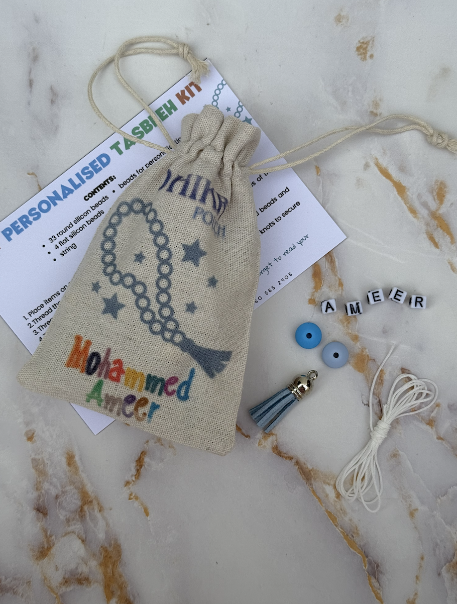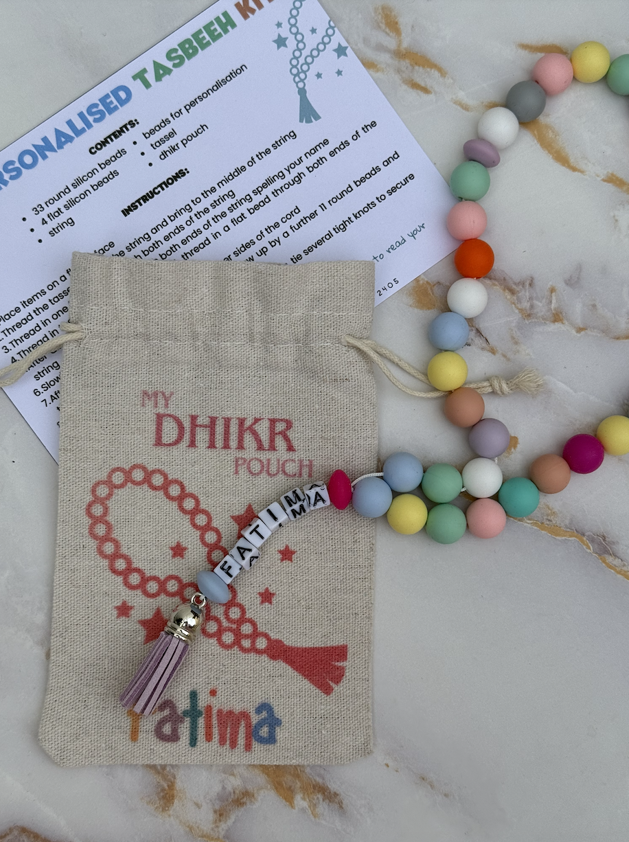 A fun activity for the kids. DIY personalised tasbeeh kit. Kit includes all items to make tasbeeh, instruction card and a personalised pouch.